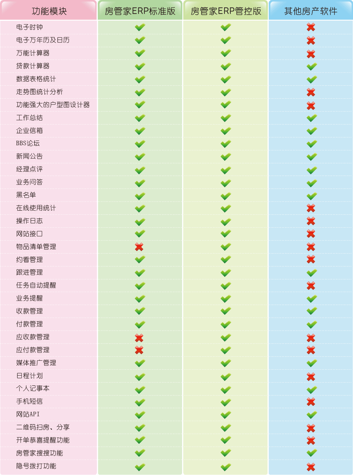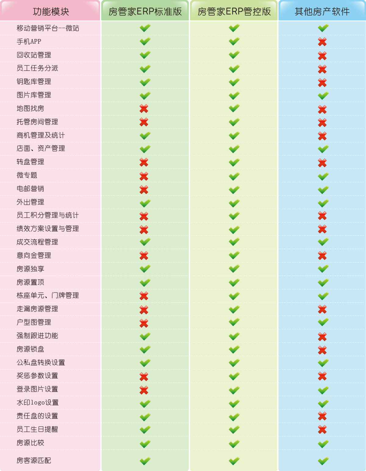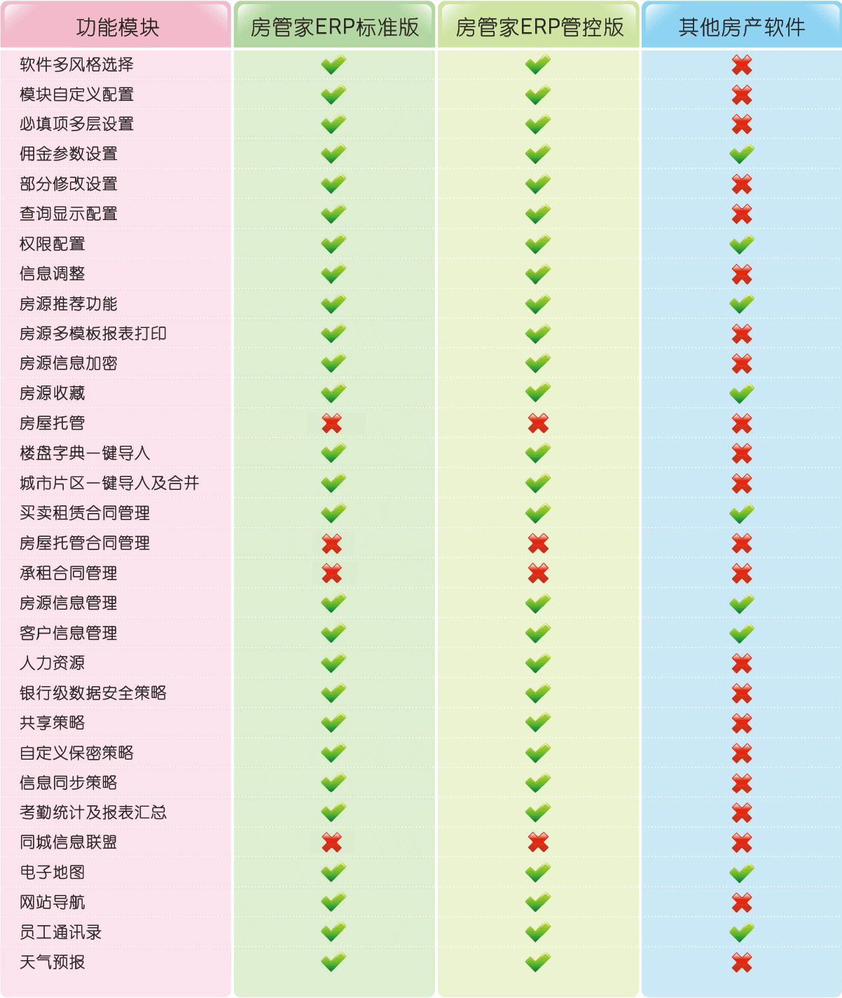 實(shí)現(xiàn)操作種類、權(quán)限級(jí)別、員工職務(wù)的多維綜合權(quán)限管理。操作種類權(quán)限管理,例如規(guī)定業(yè)務(wù)員只能查看和增加自己房源.不能修改和刪除房源;多鄉(xiāng)級(jí)別權(quán)限管理,例如規(guī)定業(yè)務(wù)員只能查看自己的房源.或者可以查看本部門的房源.或老可以查看其他部門的房源;多職務(wù)管理,可以指定員工為普通業(yè)務(wù)體驗(yàn)還是分行經(jīng)理等等。多級(jí)別多職務(wù)的權(quán)限管理既滿足操作的靈活性,又實(shí)現(xiàn)管理的控制性。